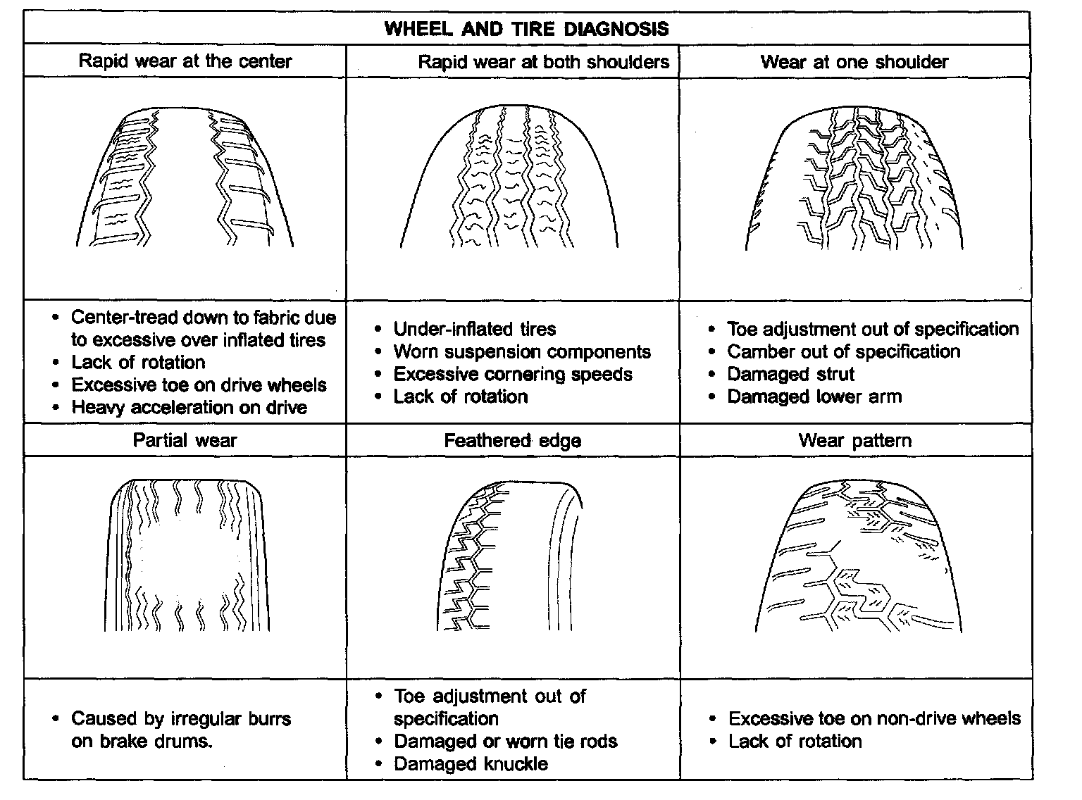 wheels. There are several symptoms that can be caused by damaged or worn tire and wheels. Carry out a careful visual inspection of the tires and wheel assemblies. Spin the tires slowly and watch for signs of lateral or radial runout. Refer to the tire wear chart to determine the tire wear conditions and actions.
