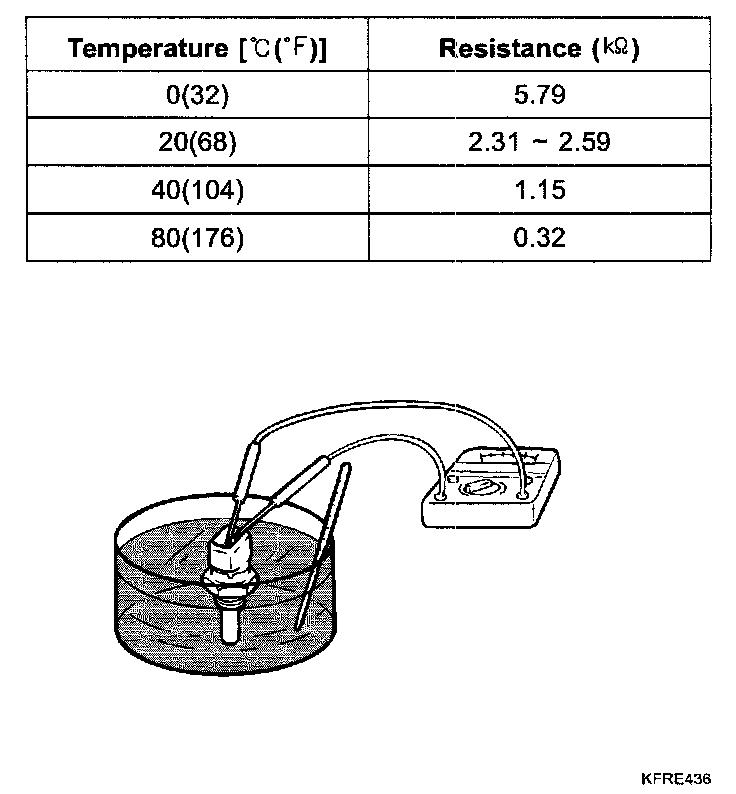 2. With the temperature sensing portion of Engine Coolant Temperature Sensor (ECTS) immersed in hot engine coolant, measure resistance between the terminals 1 and 3 of ECTS connector.