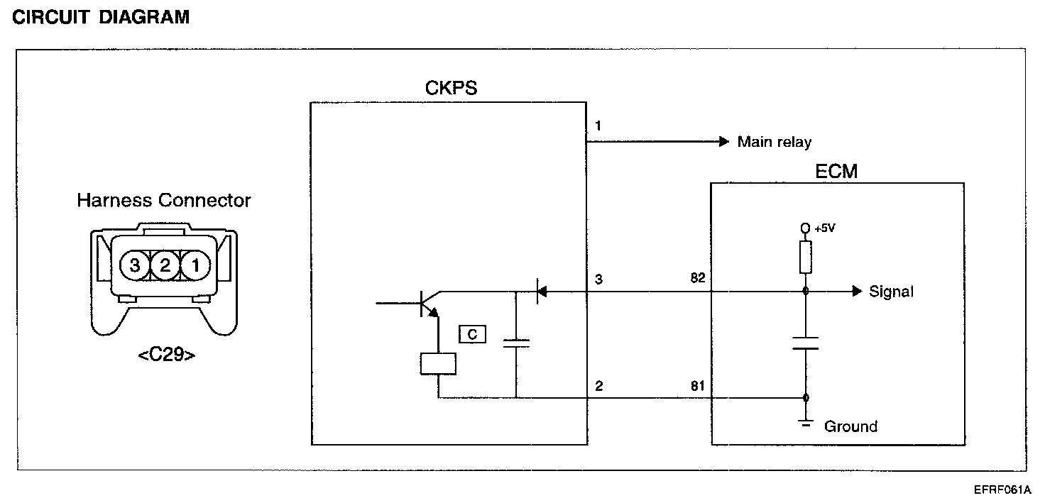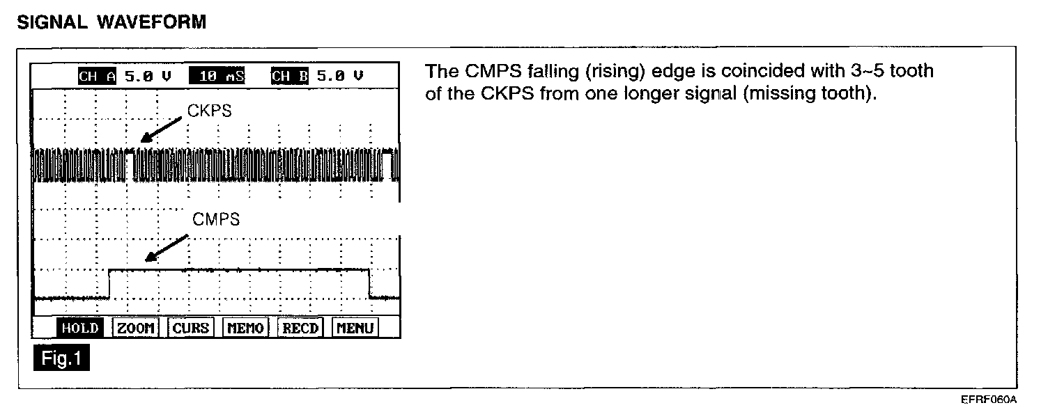 The Crankshaft Position Sensor (CKPS) is a hall effect type sensor that generates voltage using a sensor and a target wheel mounted on the crankshaft there are 58 slots in the target wheel where one is longer than the others. When the slot in the wheel aligns with the sensor, the sensor voltage outputs low. When the metal(tooth) in the wheel aligns with the sensor, the sensor voltage outputs high. During one crankshaft rotation there are 58 rectangular signals and one longer signal. The ECM calculates engine RPM by using the sensor's signal and controls the injection duration and the ignition timing. Using the signal differences caused by the longer slot, the ECM identifies which cylinder is at top dead center.