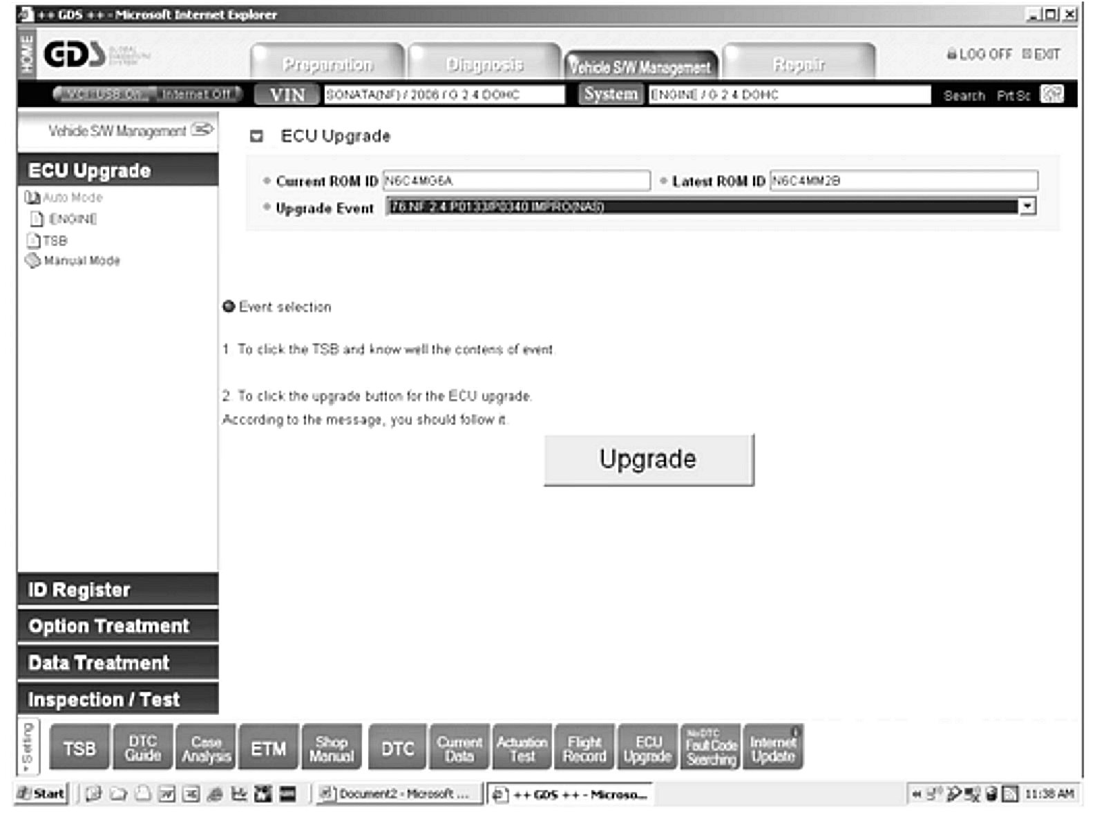 Select Upgrade Event: 76 NF 2.4 P0133/P0340 and then press the UPGRADE button as shown.