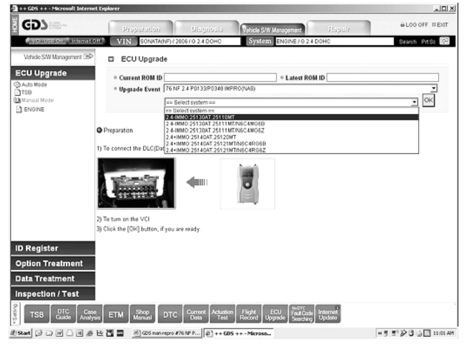 2. Within the ECU Upgrade screen in the left column select Manual Mode followed by ENGINE. Then select Upgrade Event: 76 NF 2.4L P0133/P0340 followed by the System menu item from the table shown based on the original ROM ID information.