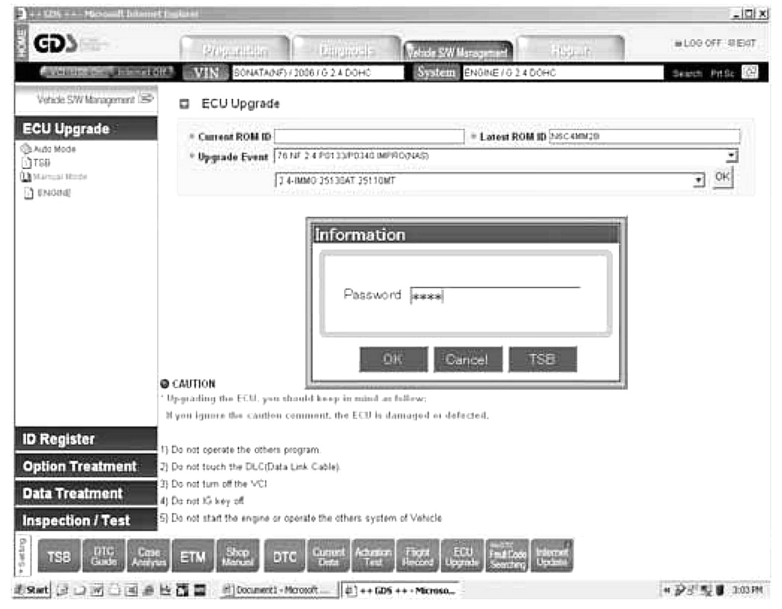 3. Next enter the appropriate password from the table shown and hit OK in the ECU Upgrade screen shown.
