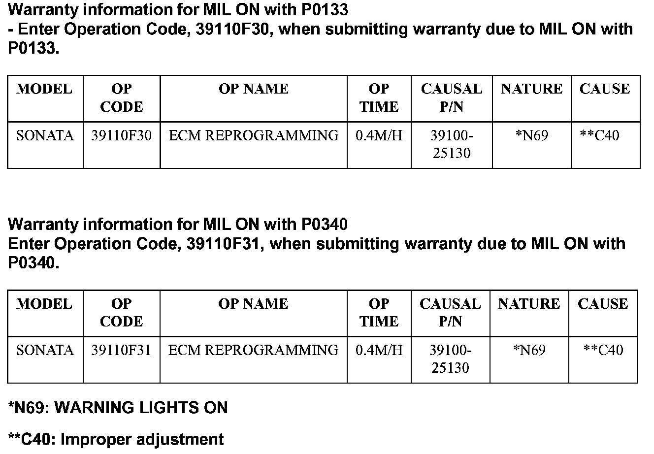 On SONATA(NF) 2.4L vehicles, the MIL (Malfunction Indicator Light) may illuminate with DTC P0133 or P0340 stored in the ECM even though there are no system faults.