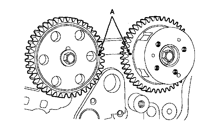 b. Check that the mark (A) of the camshaft timing sprockets are in straight line on the cylinder head surface as shown in the illustration.