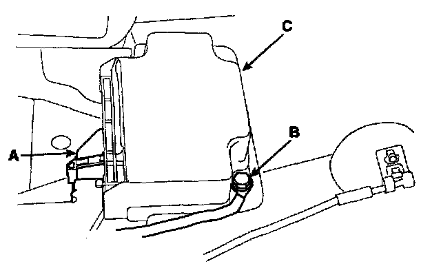 4. Pull back the lever, then disconnect the SRSCM harness connector(A). Loosen the bolt(B), then remove the SRSCM(C).