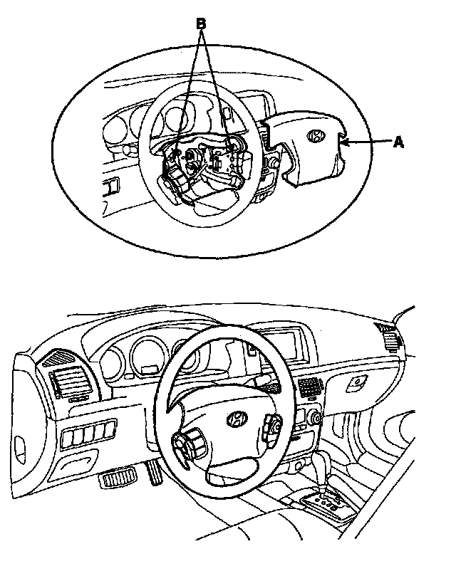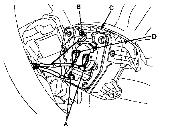 3. Disconnect the connectors(A) after lifting up the pin(D) and the horn connector(B). Remove the driver's airbag(C) from the steering wheel.