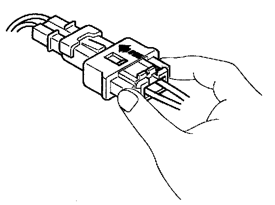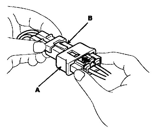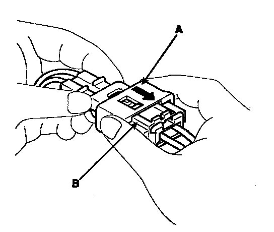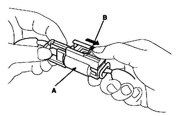 1. To reconnect, hold the pawl-side connector half, and press on the back of the sleeve-side connector half in the direction shown. As the two connector halves are pressed together, the sleeve (A) is pushed back by the pawl (B). Do not touch the sleeve.