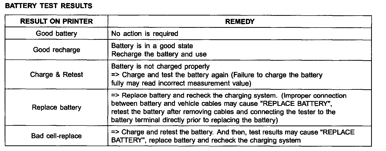 A relevant action must be given according to the test results by referring to the battery test results as shown in the table below.