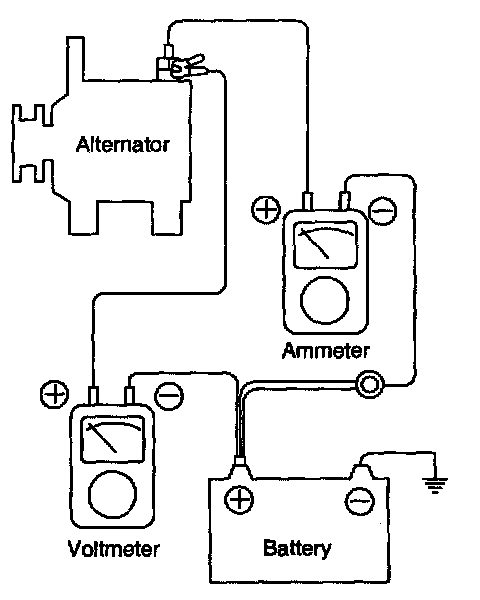 3. Run the engine at a speed of about 2,500 rpm and read the voltmeter when the alternator output current drops to 10 A or less