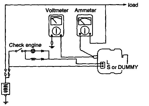 1. Check to see that the voltmeter reads as the same value as the battery voltage. If the voltmeter reads 0 V, and the open circuit in the wire between alternator "B" terminal and battery (-) terminal or poor grounding is suspected.