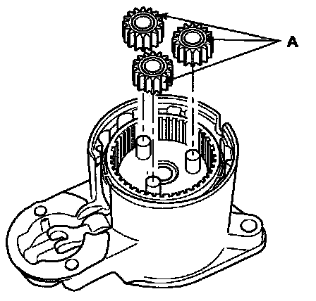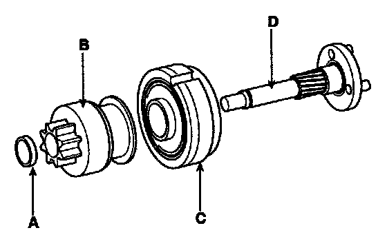 11. Disconnect the stop ring (A), overrunning clutch (B), internal gear (C) and planet shaft (D).