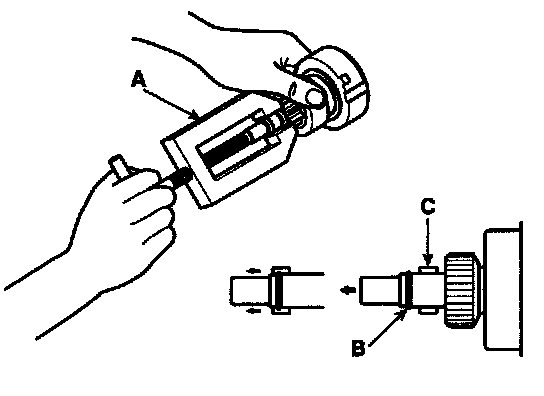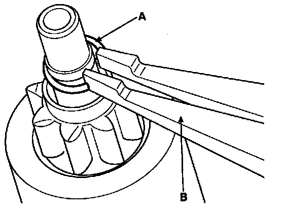 NOTE: Using a suitable pulling tool (A), pull the overrunning clutch stop ring (B) over the stopper (C).