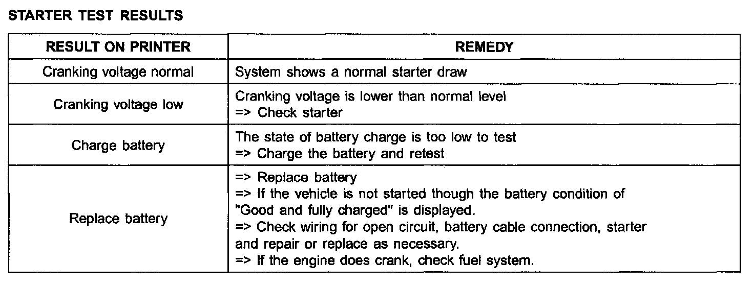Take a relevant action according to the test results by referring to the starter test results as given below.