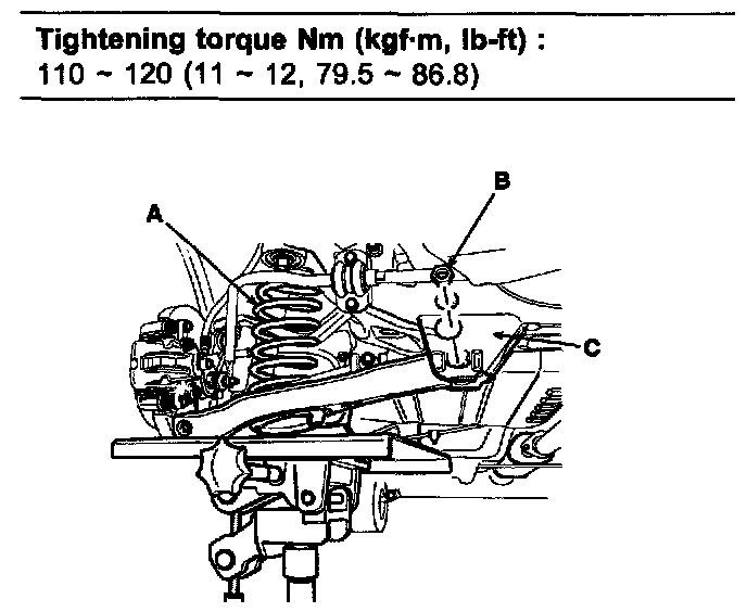1. Install the lower arm mounting bolts (B) to the cross member (C) with a specified torque.