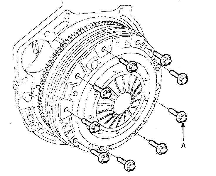 2. Remove the clutch cover bolts(A). Not to be bent or twisted, loosen them in diagonal directions.
