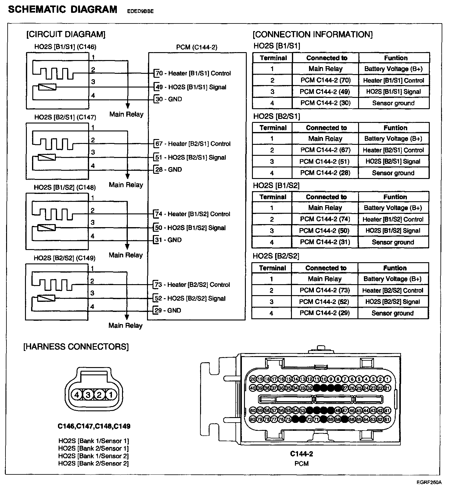 In order to control emissions of the CO, HC and NOx components of the exhaust gas, heated oxygen sensor (HO2S), mounted on the front side and rear side of catalytic converter, detects the oxygen content in the exhaust gas. The front HO2S signal is used to control air/fuel ratio (closed loop fuel control) and the rear HO2S signal is used to monitor front HO2S and catalyst for proper operation.The HO2S requires a minimum temperature to operate properly and provide a closed loop fuel control system. The HO2S contains the heater element to reduce its warming-up time and ensure its performance during all driving conditions.The PCM controls this heater element by duty cycle. The main relay supplies voltage to the heater and the PCM provides a ground circuit for activating the heater.