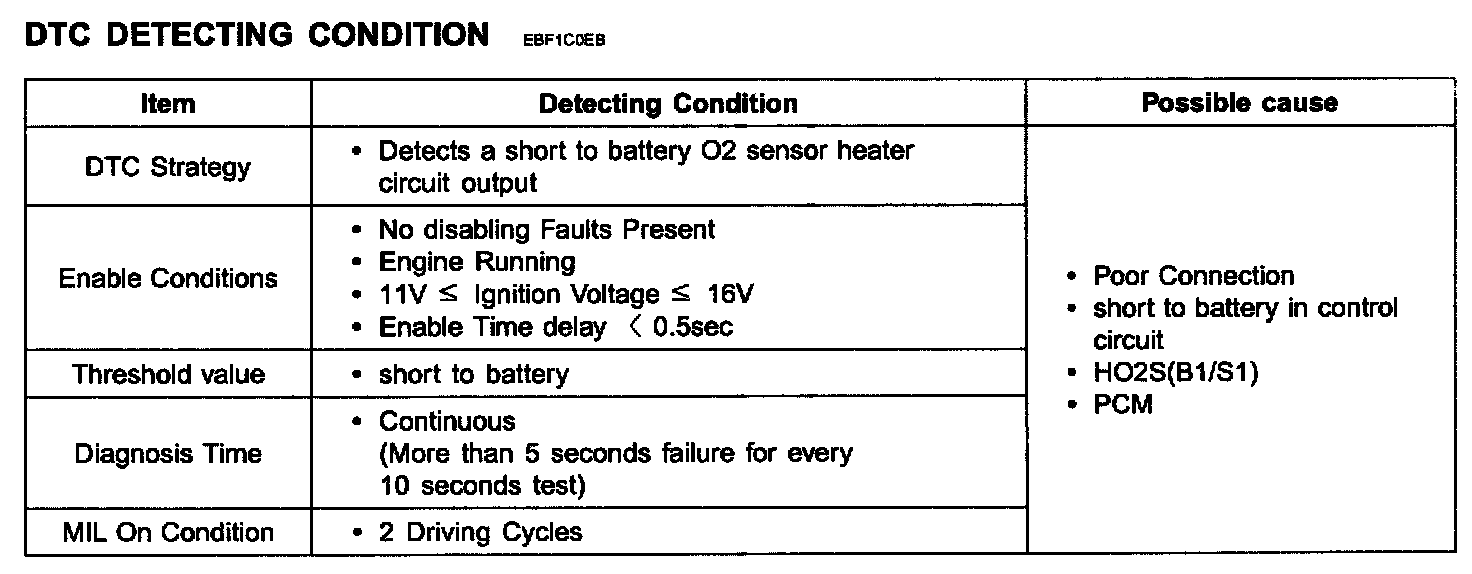 If the PCM detects heater output voltage is higher than threshold value for 5 seconds while enable condition is met PCM determines that a fault exists and a DTC is stored. MIL(Malfunction Indication Lamp) turns on when the malfunction lasts till consecutive 2 driving cycle.