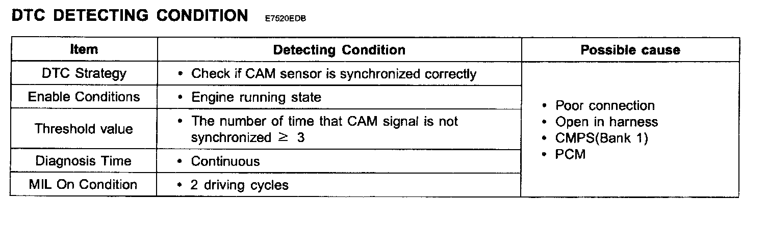 If signals from CMPS is not synchronized with CKPS for more than 3 times under detecting condition, PCM sets P0340. MIL(Malfunction Indication Lamp) turns on when the malfunction lasts till consecutive 2 driving cycle.