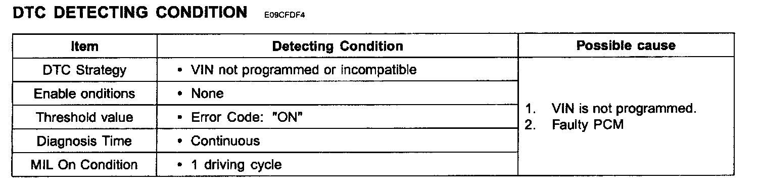 If the VIN writing is not programmed or incompatible, the PCM determines that a fault exists and a DTC is stored.MIL(Malfunction Indication Lamp) turns on when the malfunction lasts till 1 driving cycle.