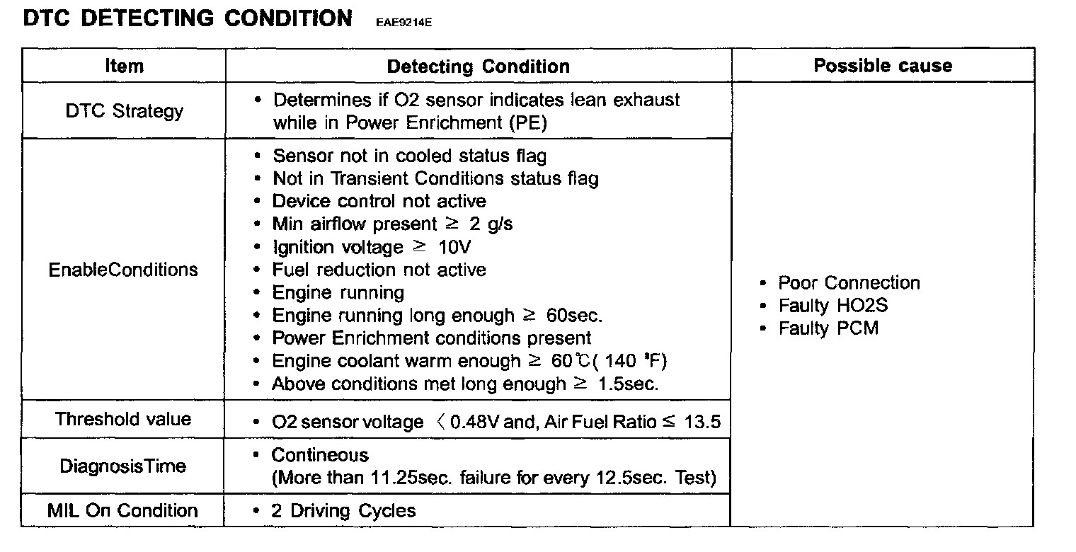 Checking output signals from HO2S under detecting condition, if an output signal within the detecting condition lasts continuously, PCM sets P2197. MIL(Malfunction Indication Lamp) turns on when the malfunction lasts till consecutive 2 driving cycle.