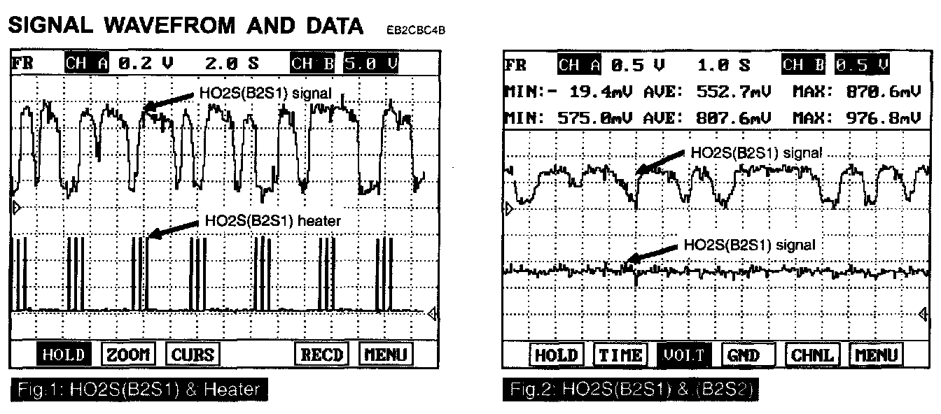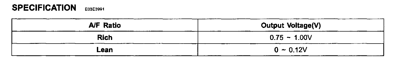 After warming-up, if accelerator pedal is released suddenly around 4000rpm, the HO2S signal reading will be lower than 200mV resulting from Fuel cut-off for the moment. Conversely, if suddenly accelerator pedal is depressed, HO2S signal reading will be around 0.6 V - 1.0 V. At idle, HO2S signal will switch from lean to rich normally.