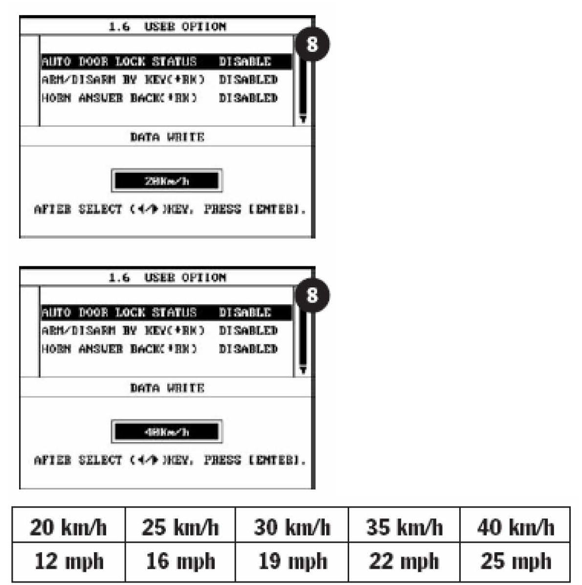 The Hi-Scan tool displays the locking speed in kilometers / hour. See table for conversion to mph.