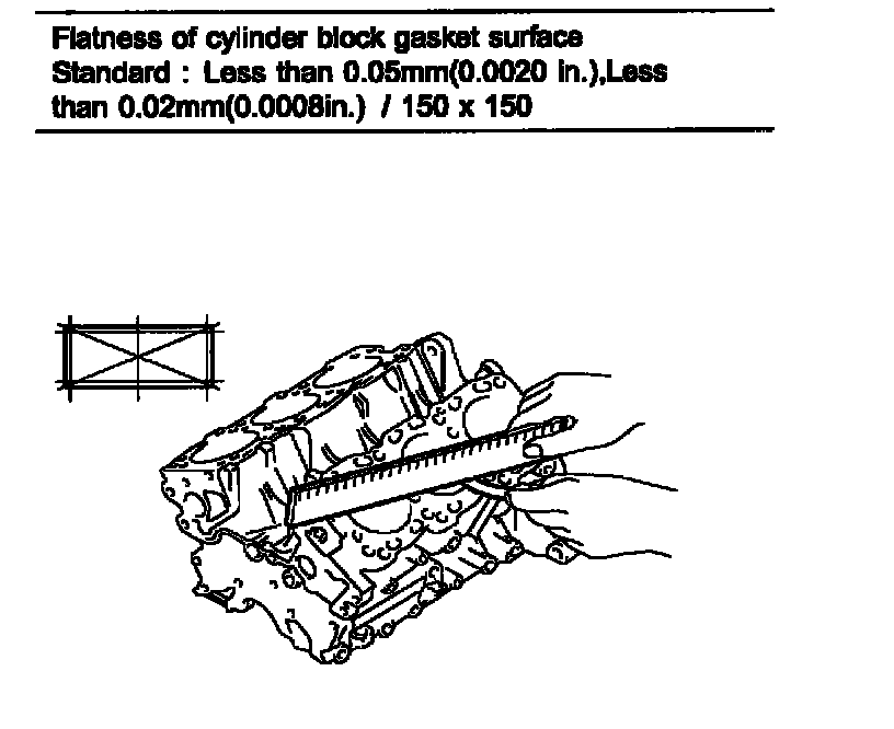 3. Inspect top surface of cylinder block for flatness. Using a precision straight edge and feeler gauge, measure the surface contacting the cylinder head gasket for warpage.