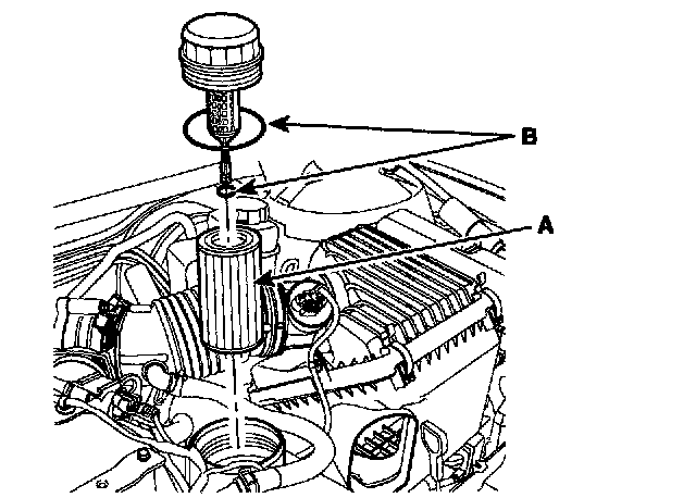 e. Install new oil filter element (A) and two O-rings (B).