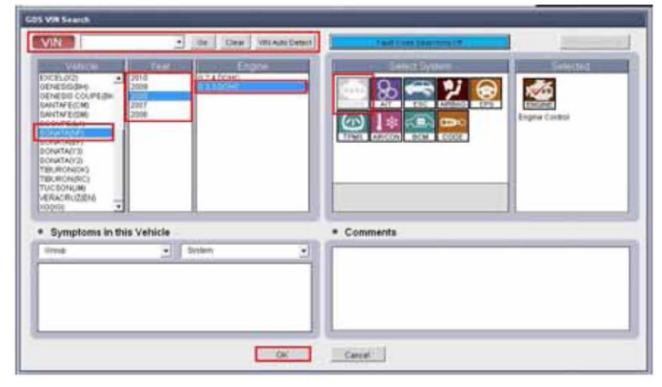 2. Enter the vehicle information by pressing the VIN Auto Detect button, entering the vehicle's VIN or selecting the vehicle model, model year, engine/fuel type and ENGINE as the system and then click OK.