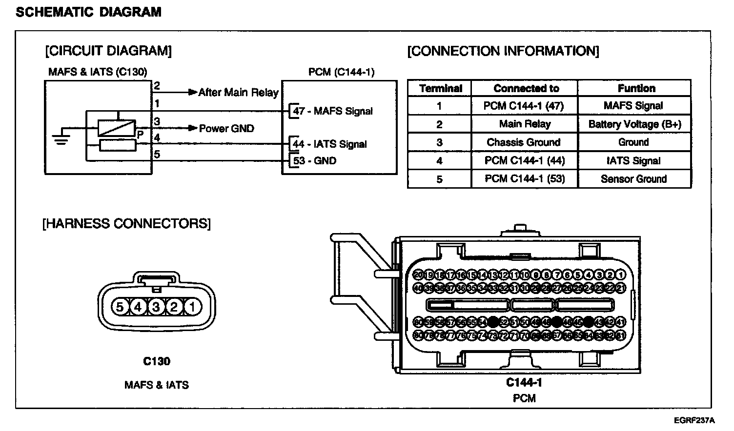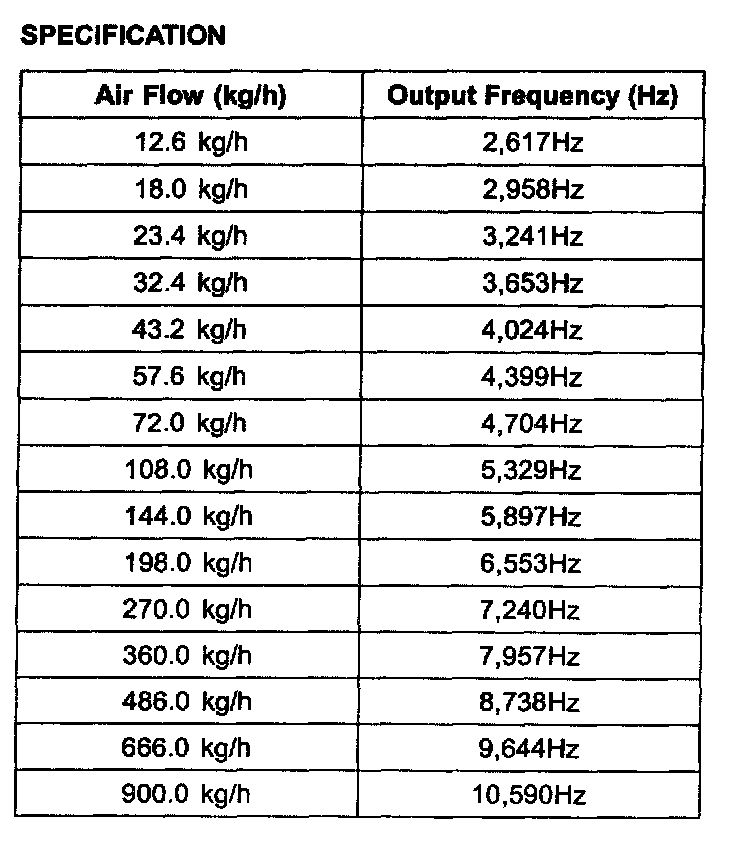 Mass Air Flow Sensor (MAFS) is a hot-film type sensor and is located in between the air cleaner and the throttle body. It consists of a tube, a sensor assembly and honey cell and detects intake air quantity flowing into the intake manifold. While the intake air coming out of the air cleaner flows by the honey cell, it becomes laminar flow, and then it passes the hot-film. At this time, heat transfer is generated by convection and this sensor loses its energy. This sensor detects the mass air flow by using the energy loss and transfers the information to the PCM by frequency. The PCM calculates fuel quantity and ignition timing.