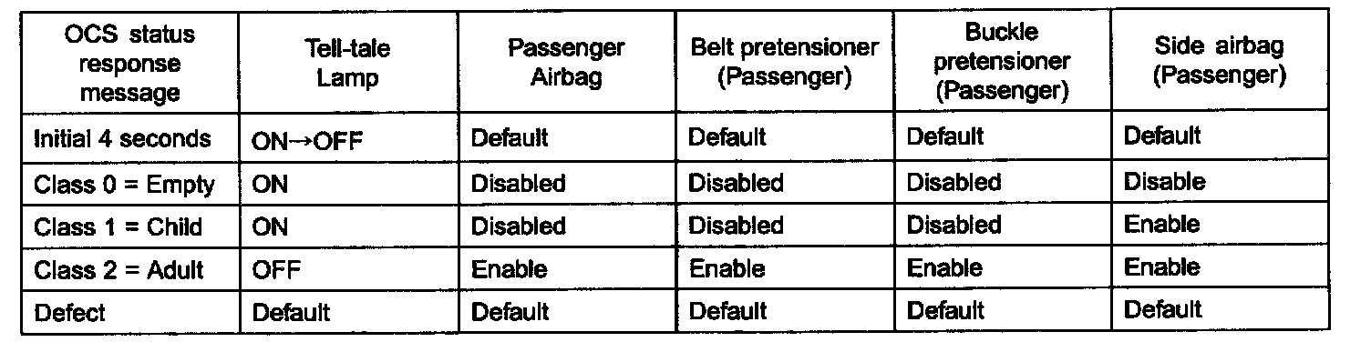 The Telltale Lamp indicates the Passenger Airbag(PAB) enable and disable status based on occupant status of passenger seat. If the passenger seat is empty or occupied with a child (or child seat), the Passenger Airbag is disabled and the Telltale Lamp is turned ON to inform the driver that the PAB is disabled. As soon as operating voltage is applied to the SRSCM ignition input, the SRSCM activates the telltale lamp for 4 seconds. OCS will send an indeterminate status to the SRSCM as a default setting for the passenger airbag deployment during the prove out period. After a crash, if OCS gets reset and sends the indeterminate status, the telltale lamp will be ON as long as the occupant status is in the indeterminate status. Occupant status information and telltale status are as table.