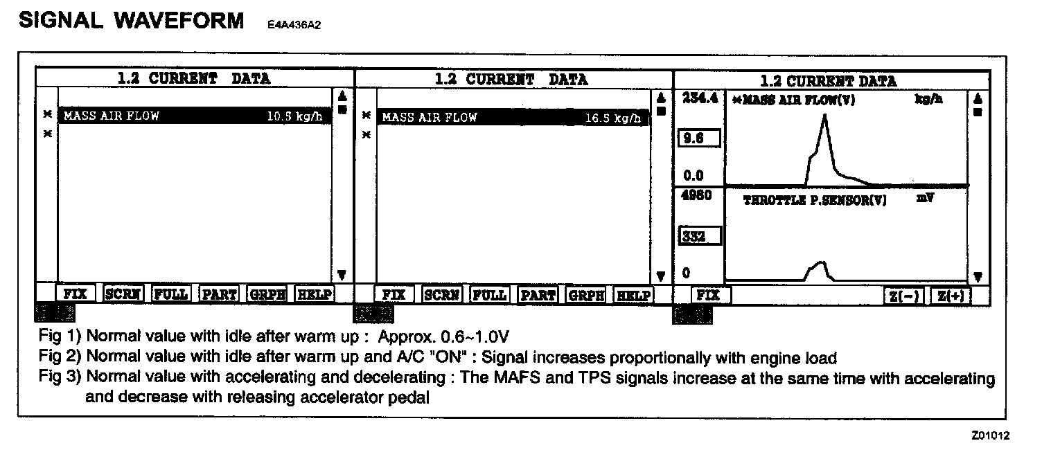 The Mass Air Flow Sensor (MAPS) is located between the air cleaner assembly and the throttle body. The MAFS uses a hot film type sensing element to measure the mass of intake air entering the engine. This hot film type air flow sensor consists of a hot film sensor, housing and metering ducts. Mass air flow rate is measured by detection of heat transfer from a hot film probe. The change in air flow rate causes change in the amount of heat being transferred from the hot film probe surface to the air. A large amount of intake air represents acceleration or high load conditions while a small amount of intake air represents deceleration or idle. The mass of intake air should increase at acceleration and be stable during constant engine speed. The PCM uses this information to determine the injection duration and ignition timing for the desired air/fuel ratio.