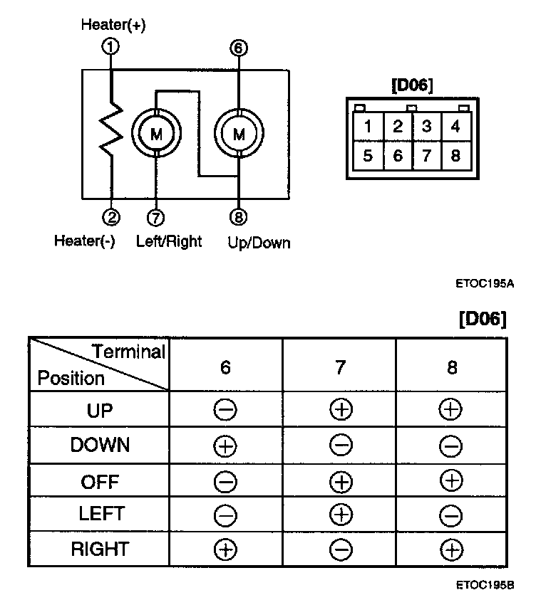 2. Apply battery voltage to each terminal as shown in the table and verify that the mirror operates properly.