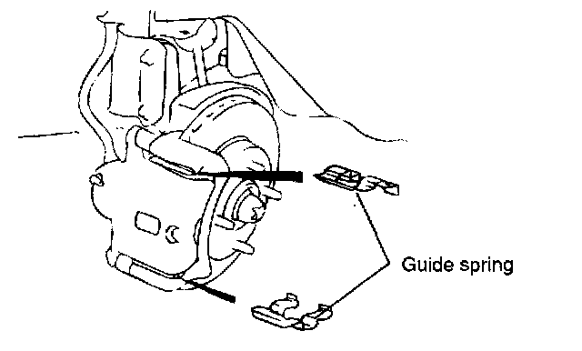 - When replacing the brake pad, check for deformation. When replacing the guide spring, use a new one or the used one after cleaning away foreign material.