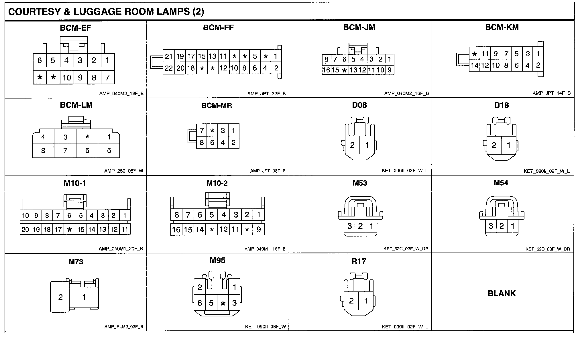 Courtesy & Luggage Room Lamps Connector Pin Outs: