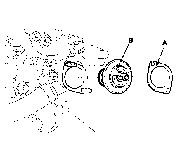 2) Install a new gasket (A) to the thermostat (B).
