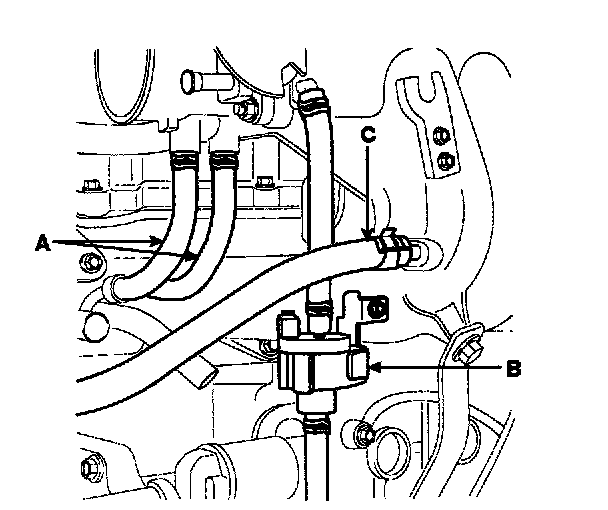 6. Remove the heater hoses (A), PCSV (B), and brake vacuum hose (C).