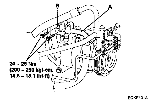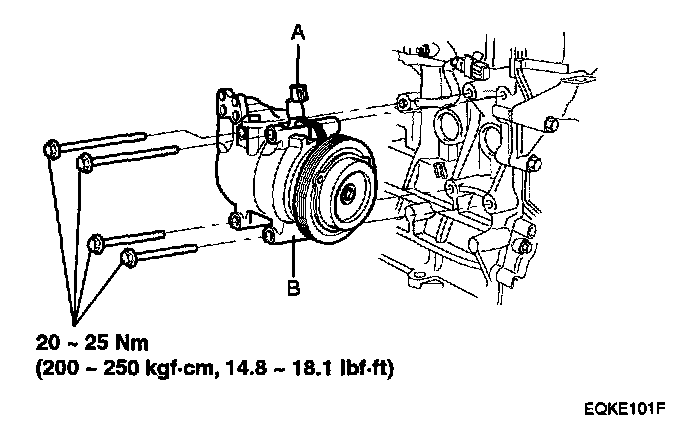 6. Disconnect the compressor clutch connector(A), then remove the mounting bolts and the compressor(B).