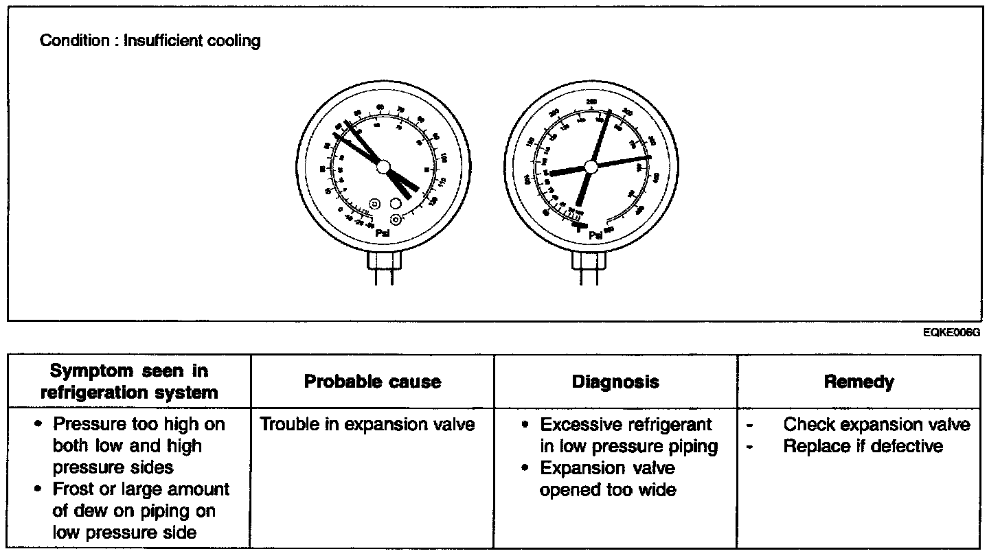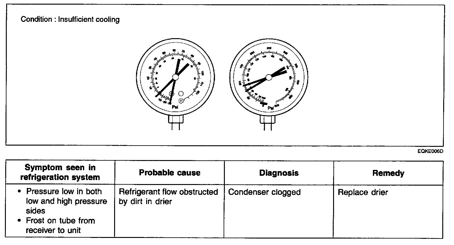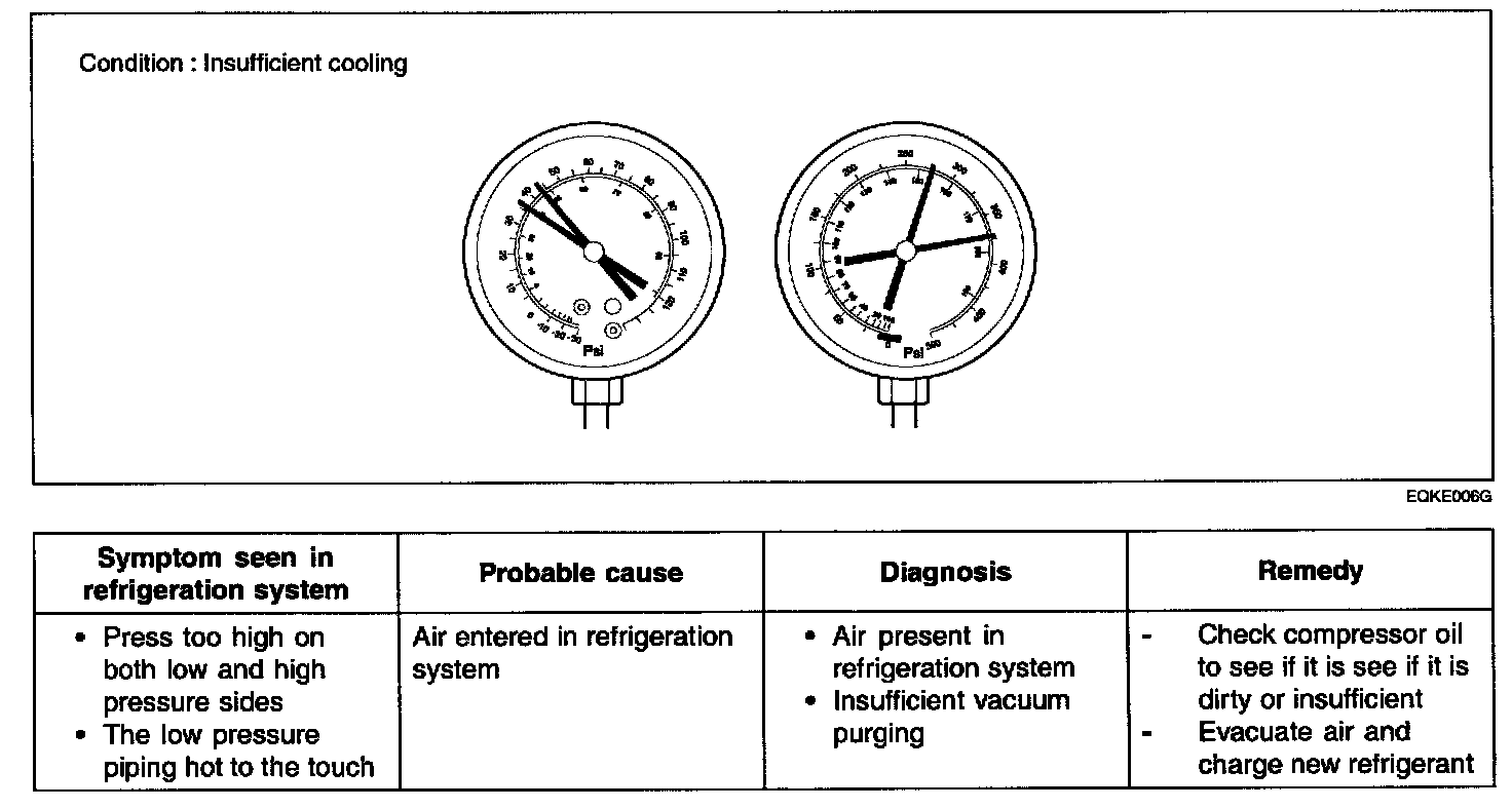 This is a method in which the trouble is located by using a manifold gauge set. Read the manifold gauge pressure when the these conditions are established.