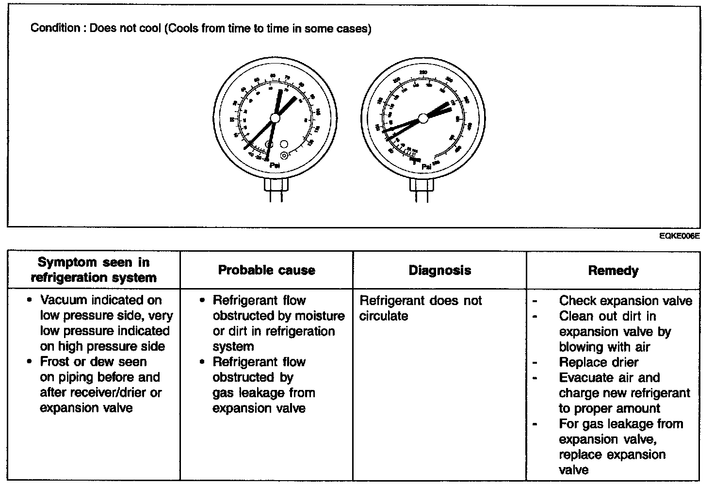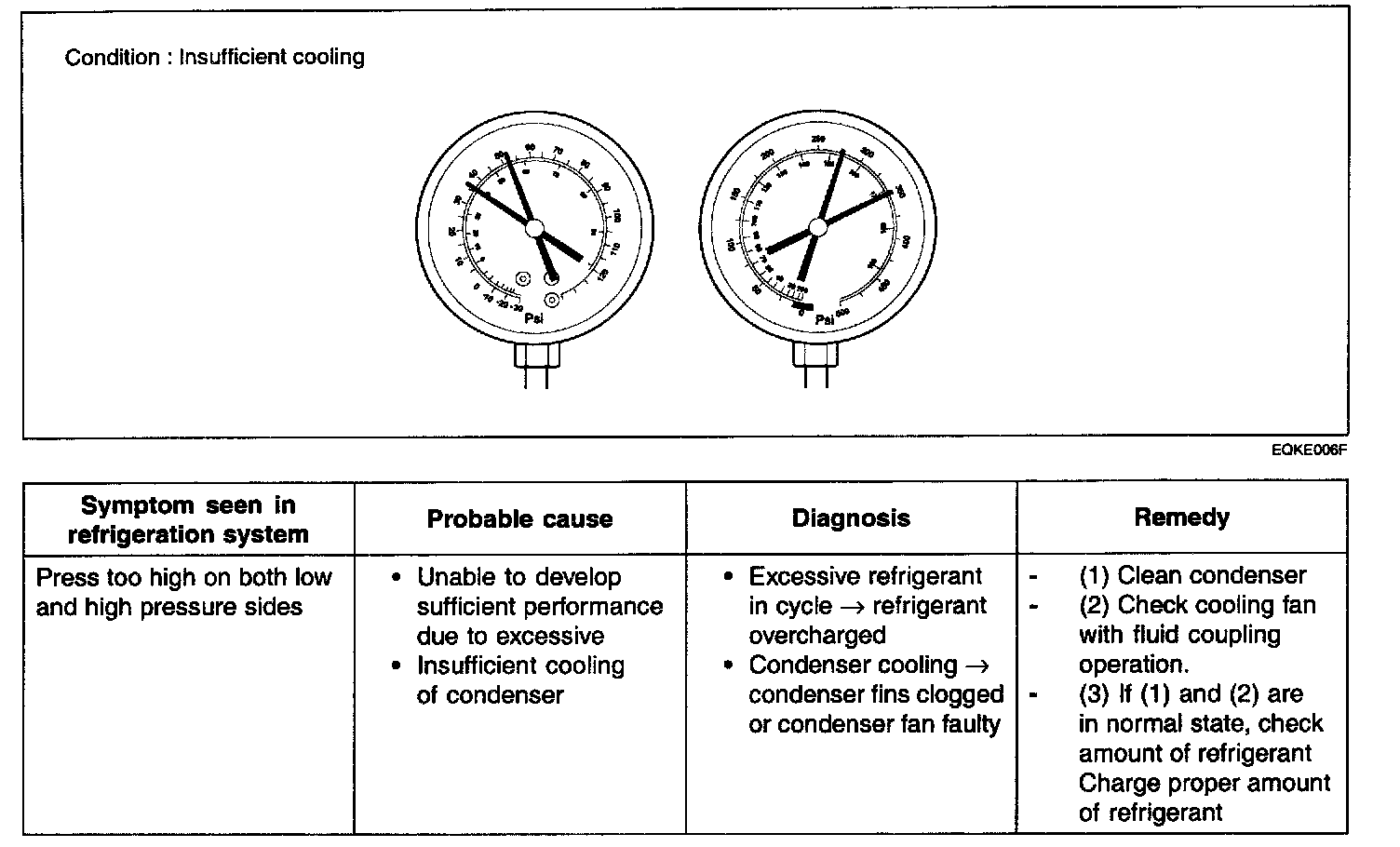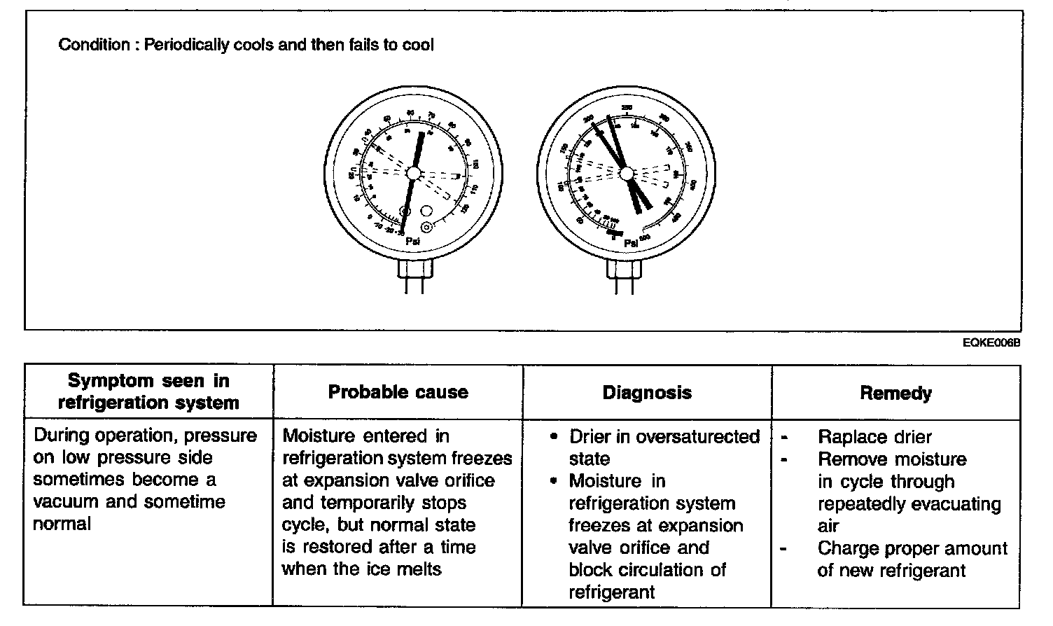 This is a method in which the trouble is located by using a manifold gauge set. Read the manifold gauge pressure when the these conditions are established.