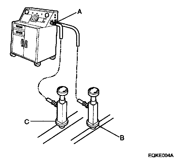 2. Connect a R-134a refrigerant recovery/recycling/charging station(A) to the high-pressure service port(B) and the low-pressure service port(C), as shown, following the equipment manufacturer s instruction. Evacuate the system.