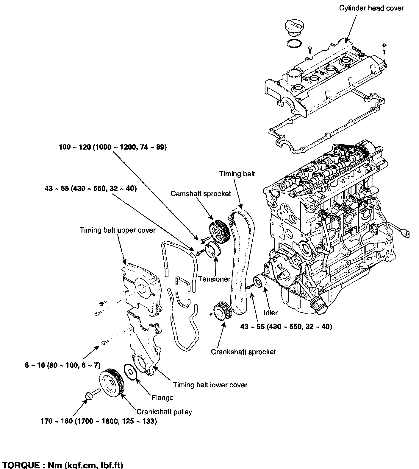 Tensioner bolt 43 - 55 Nm (430 - 550, kgf-cm, 32 - 40 ft. lbs.)