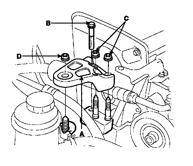 2) Remove the bolt (B), 3 nuts (C, D) and engine mount bracket (A).