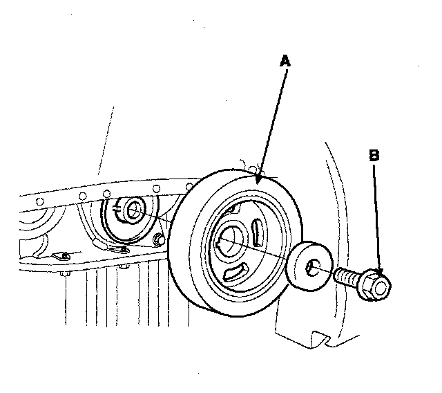 12. Remove the crankshaft pulley bolt (B) and crankshaft pulley (A).