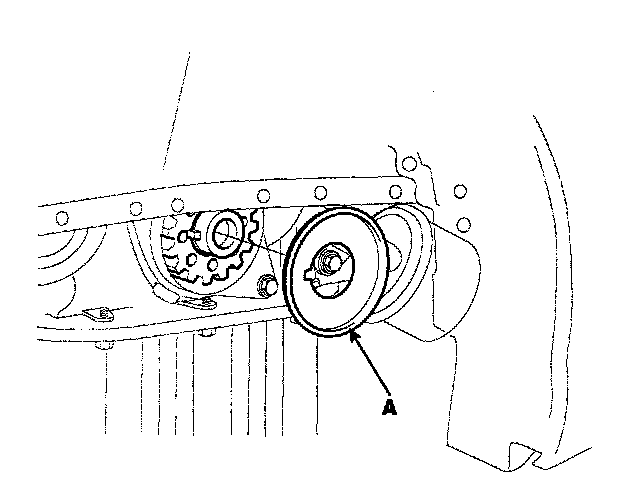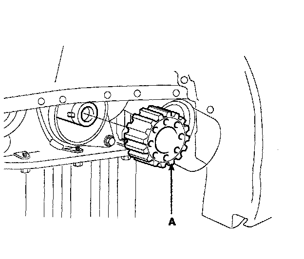 12. Install the flange and crankshaft pulley (A). Make sure that crankshaft sprocket pin fits the small hole in the pulley.