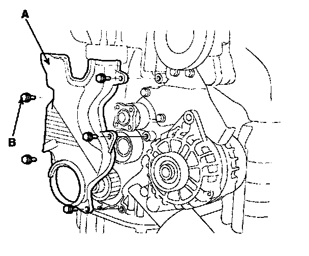 11. Install the timing belt lower cover (A) with 5 bolts (B).