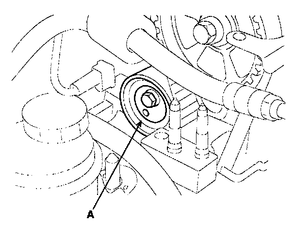 6. Temporarily install the timing belt tensioner (A) with plain washer (B).