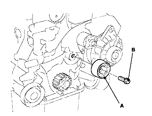 15. Remove the timing belt tensioner (A) and timing belt (B).