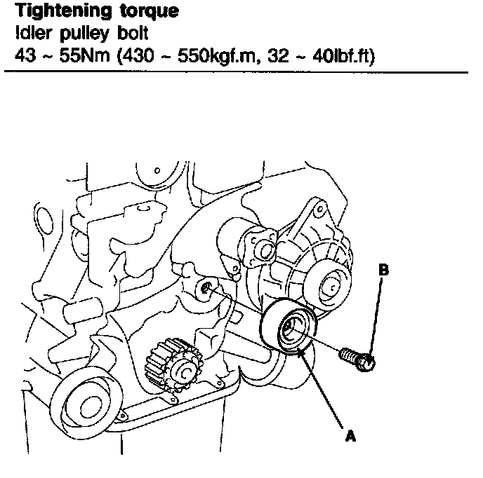 5. Install the idler pulley (A) and tighten the bolt (B) to the specified torque.