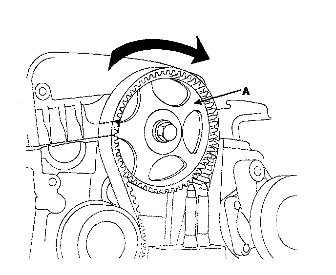 1) Rotate crankshaft in regular direction (clockwise view from front) through angle equivalent to two teeth (180°) of camshaft sprocket (A).